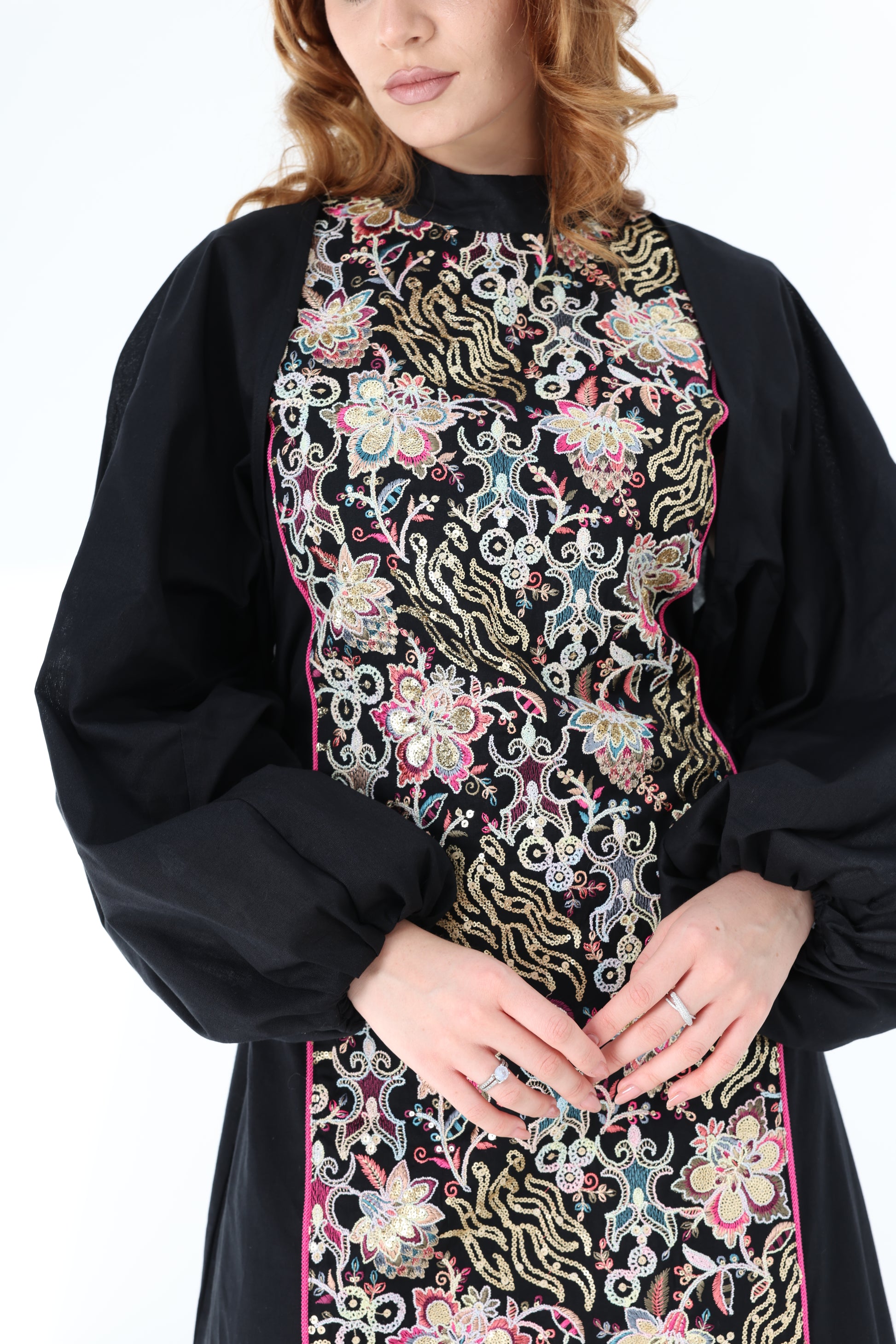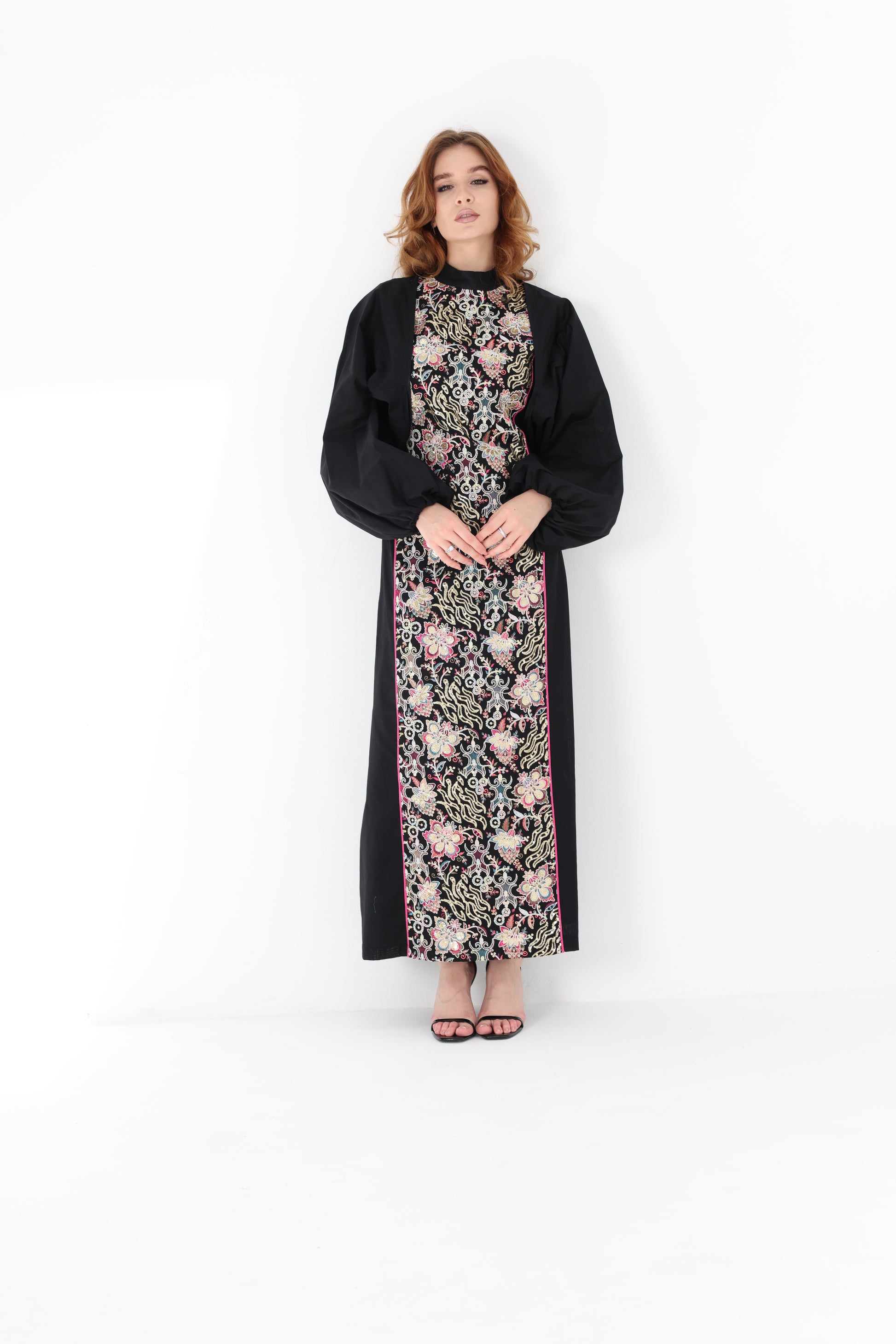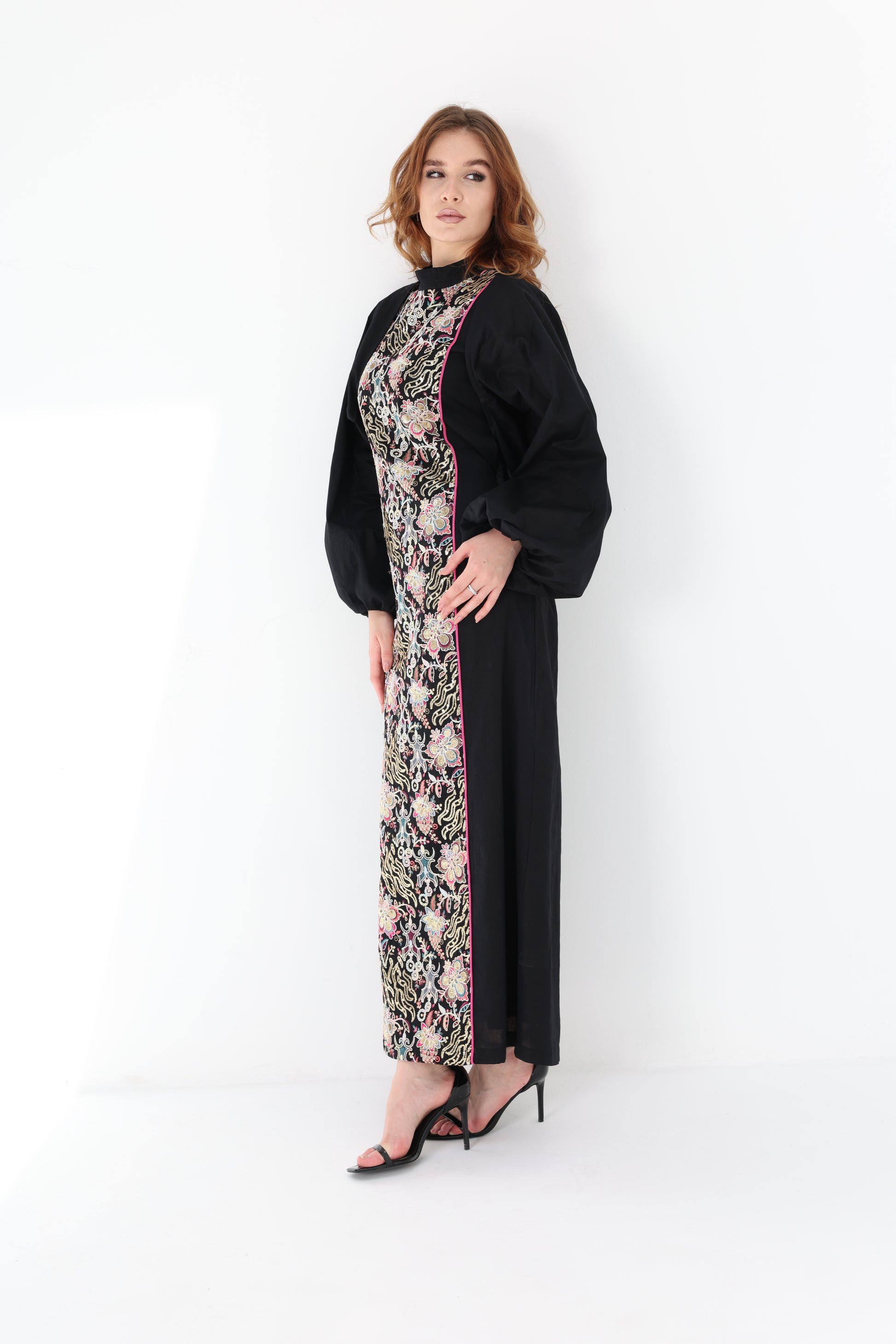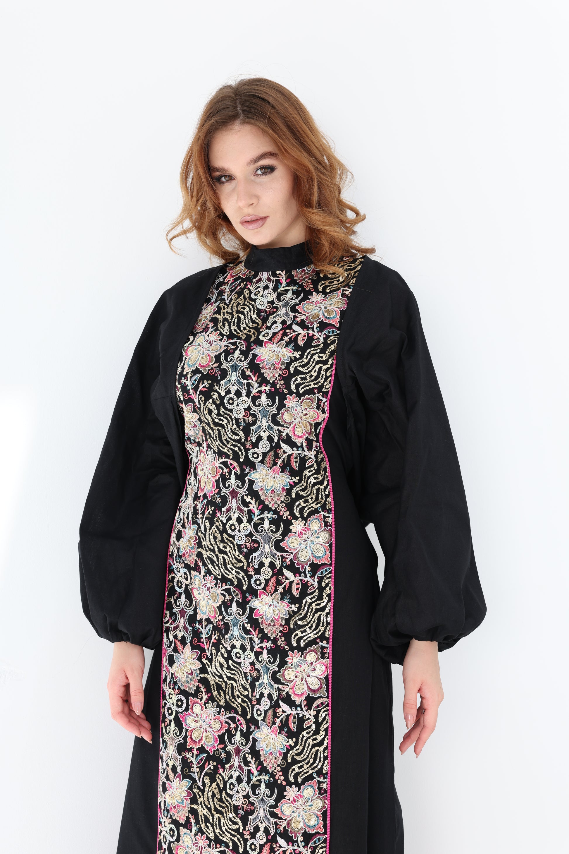 Set consists of dress and puffy sleeves cape.